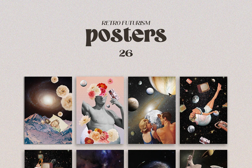 Сollection created in the best traditions of retro-futurism and surreal space fantasies. Carefully hand-carved digital collages are created from old vintage magazines, books, catalogs often found in thrift stores, second-hand bookstores, markets and garages.